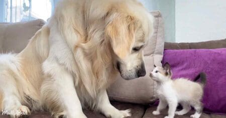 Moment of bliss when Golden Retriever meets a kitten for the first time