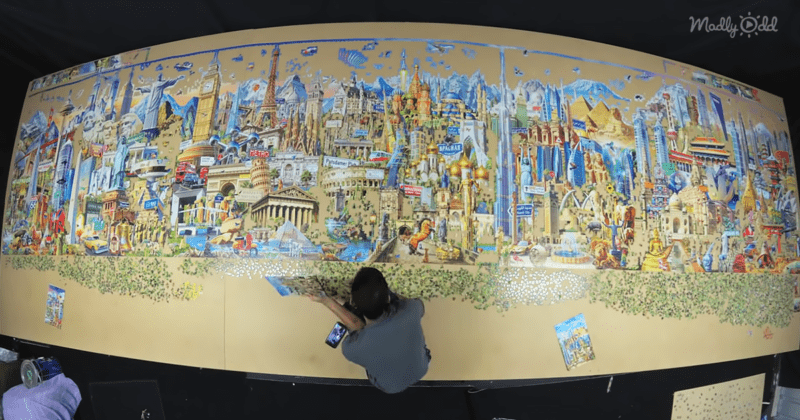 Just like anyone else, he starts by making the exterior border of the puzzle. He continues to put together small sections here and there. We begin to see famous buildings pop up as he finishes the puzzle. It ends up over five feet tall and nearly 25 feet long.