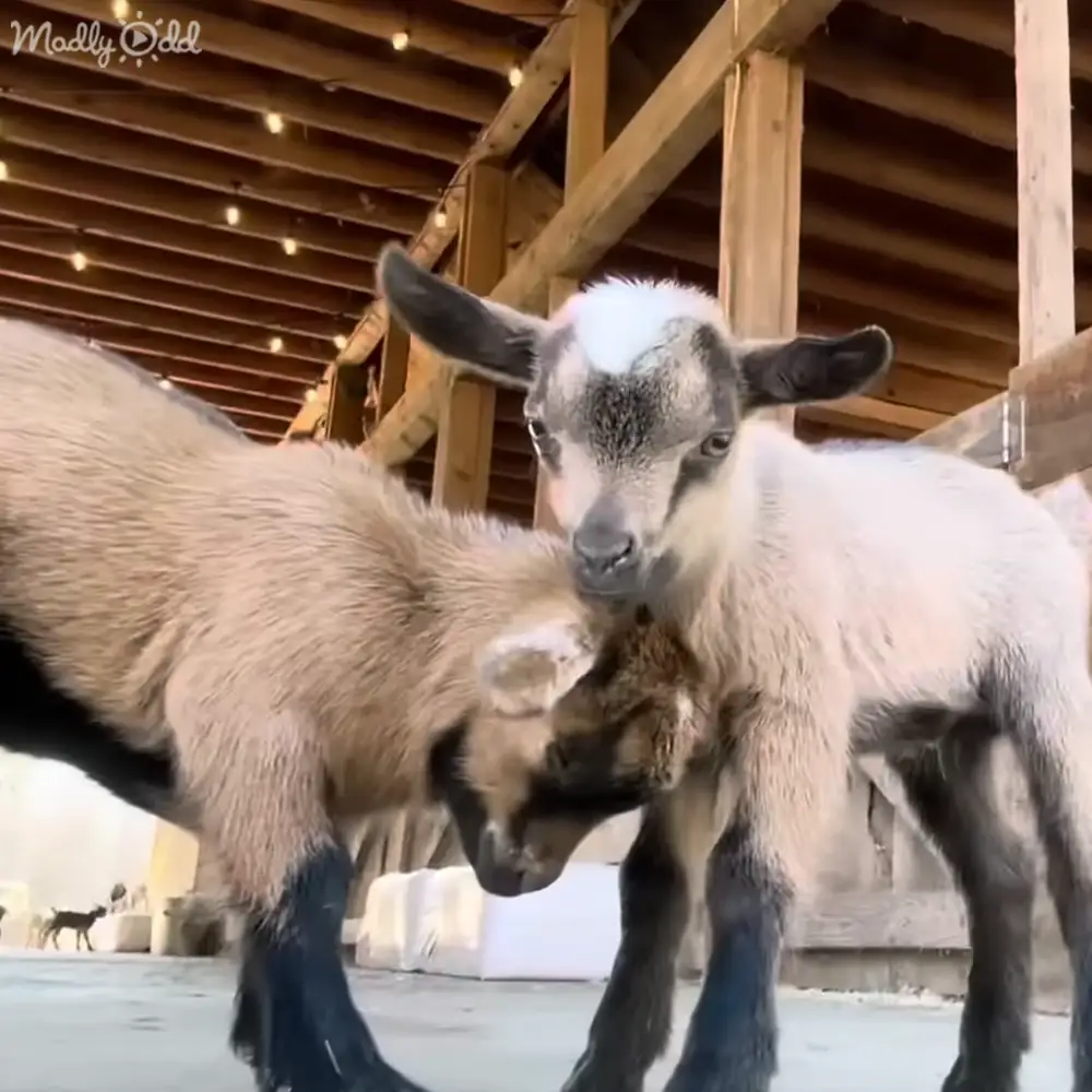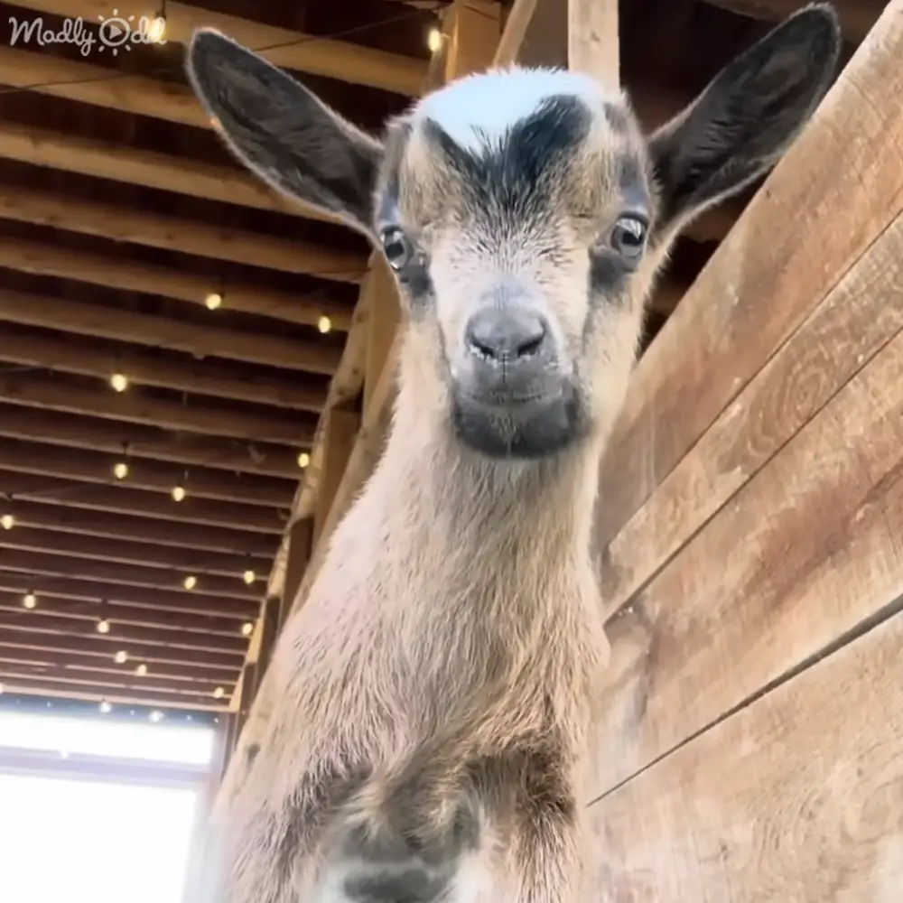 These baby goats, ranging in age from a mere day to a week old, may be small, but they are full of energy and friendliness. The video begins with a close-up of a curious kid gazing directly into the camera, showcasing its adorable, innocent face.