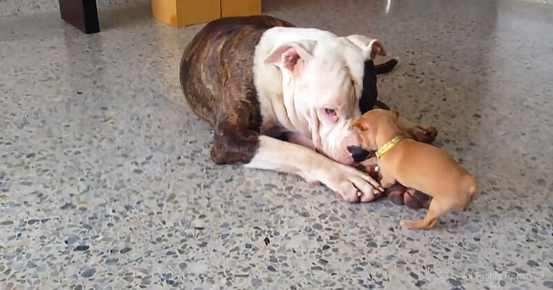 This tiny Chihuahua pup just won’t be told no. His friend, an American Bulldog, is more than three times his size, but he really wants to play!