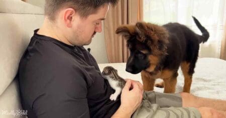 German Shepherd Puppy’s Adorable Reaction to Cuddling Tiny Kitten