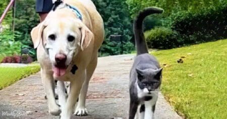 Oliver the cat cherishes walks with canine best friends