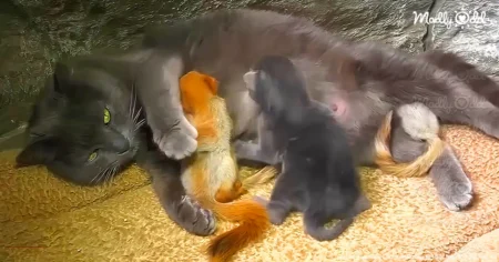Mama cat raises orphaned baby squirrels with her kittens