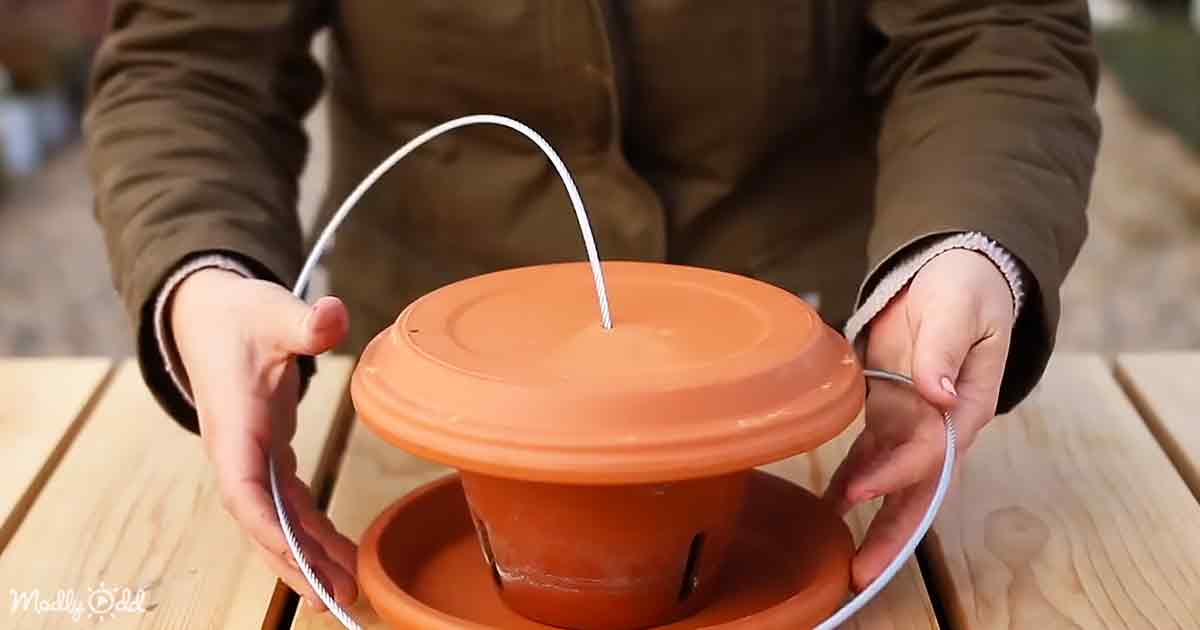 Next, she teaches to prepare an orchid pot bird feeder. She takes two clay saucers and a drilling machine with a 1/8″ glass and tile bit. She drills two small holes in the saucers. Next, she picks a 1/8″ braided cable and an end-stop ferrule. She slides the cable through the ferrule and tightens it using a hand swagger. Next, she slides the line through one of the saucers and an old orchid pot, which she places on top of the saucer.