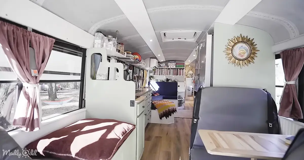 The heart of any home lies in its kitchen, and this bus is no different. A kitchen that boasts open shelves displaying grains, spices, and memories from their former farm. The modern touch of an induction cooktop and an air fryer, replacing a traditional stove, complements the family’s preference for electric appliances. Add a dash of fun with a sink light that changes color with the water temperature, and you have a space that’s as practical as it is whimsical.