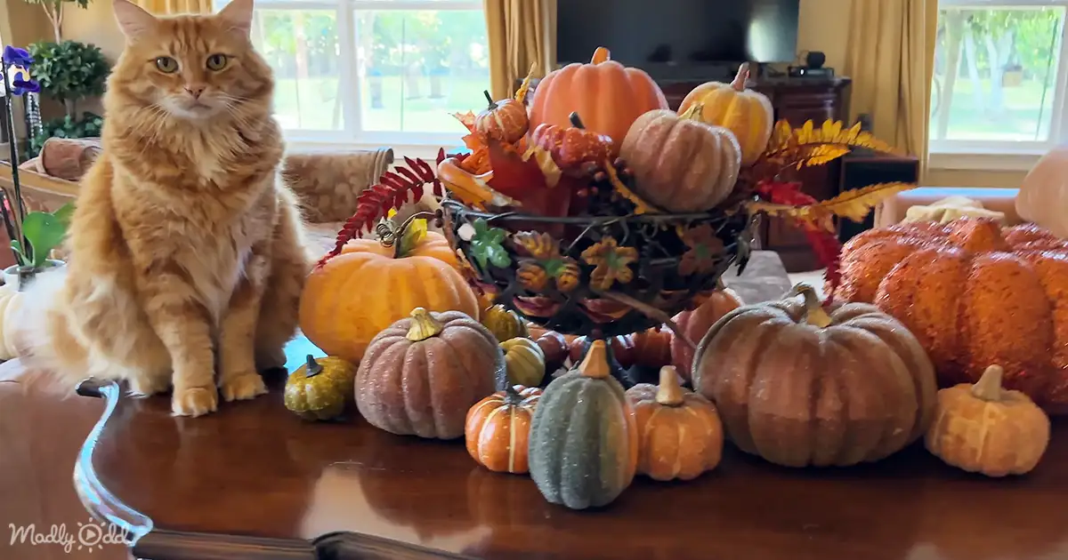 Regally resting on the center table, Jack the cat gazes at the autumn display of pumpkins and gourds. It’s a sight to behold. Maddie the Great Dane, not one to be left out, believes her rainbow toy would be the pièce de résistance.