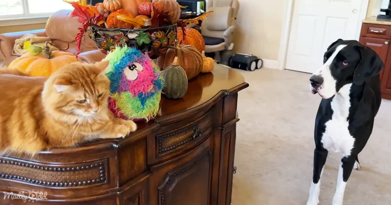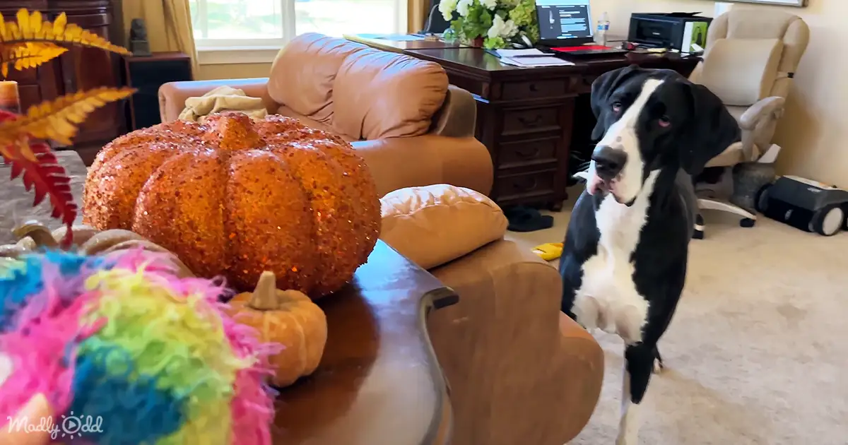 The cute cat’s surprised expressions as his Great Dane sister’s playful antics bring a hearty laugh to anyone watching. After a while, she does not seem to look at Maddie and just quietly keeps an eye on the gourds.