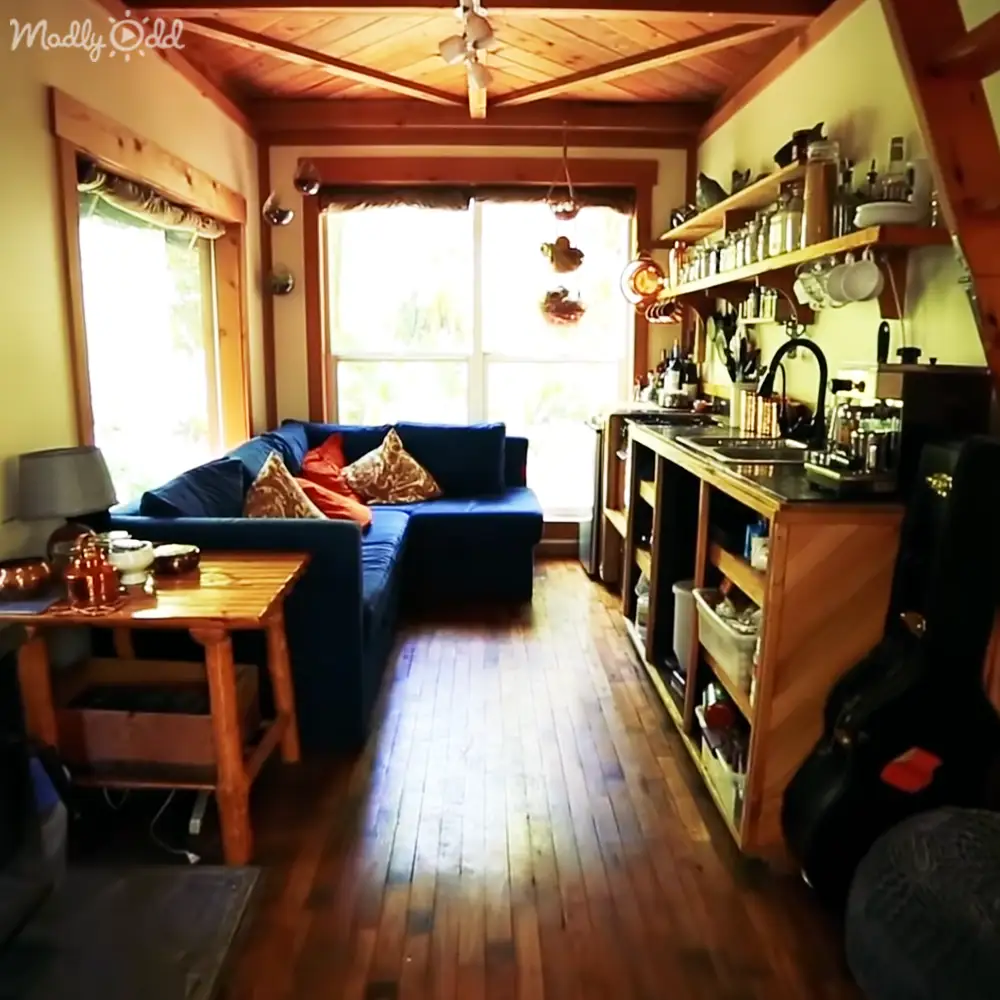 Now, let us step back and admire the exterior once more. The roof is covered in foraged moss, nestled into chicken wire, alive and growing, much like the tiny house community. It’s a living roof that epitomizes the ethos of tiny house living—growth, sustainability, and harmony.