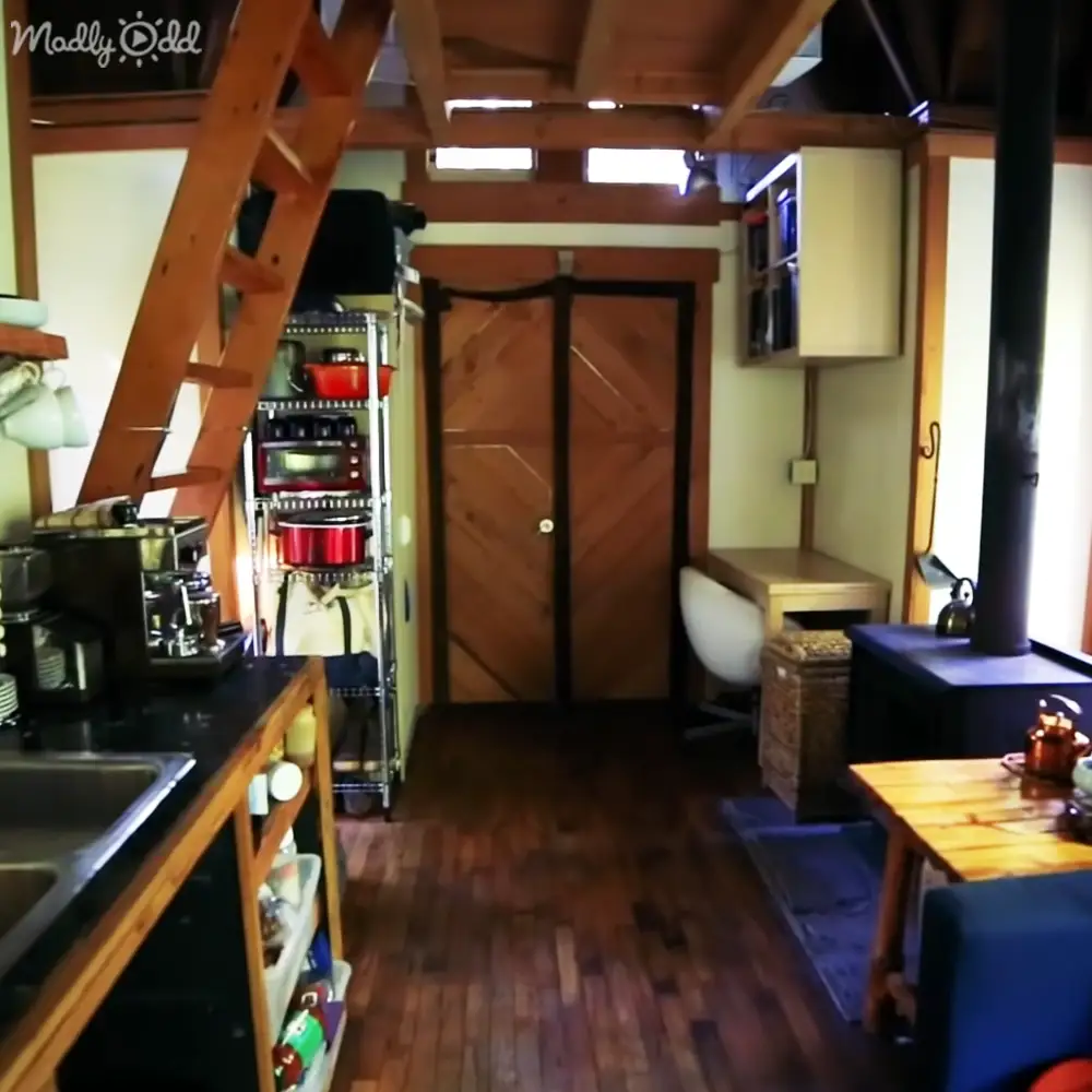 The living area, though compact, feels expansive due to the thoughtful layout. Every corner of the cabin tells a story of the material’s past life—a bowling alley repurposed into flooring, a kitchen counter with history, and a vintage RV stove. Here, the concept of home is redefined, reminding us that luxury is not about size but the richness of experiences and the art of curating simplicity.